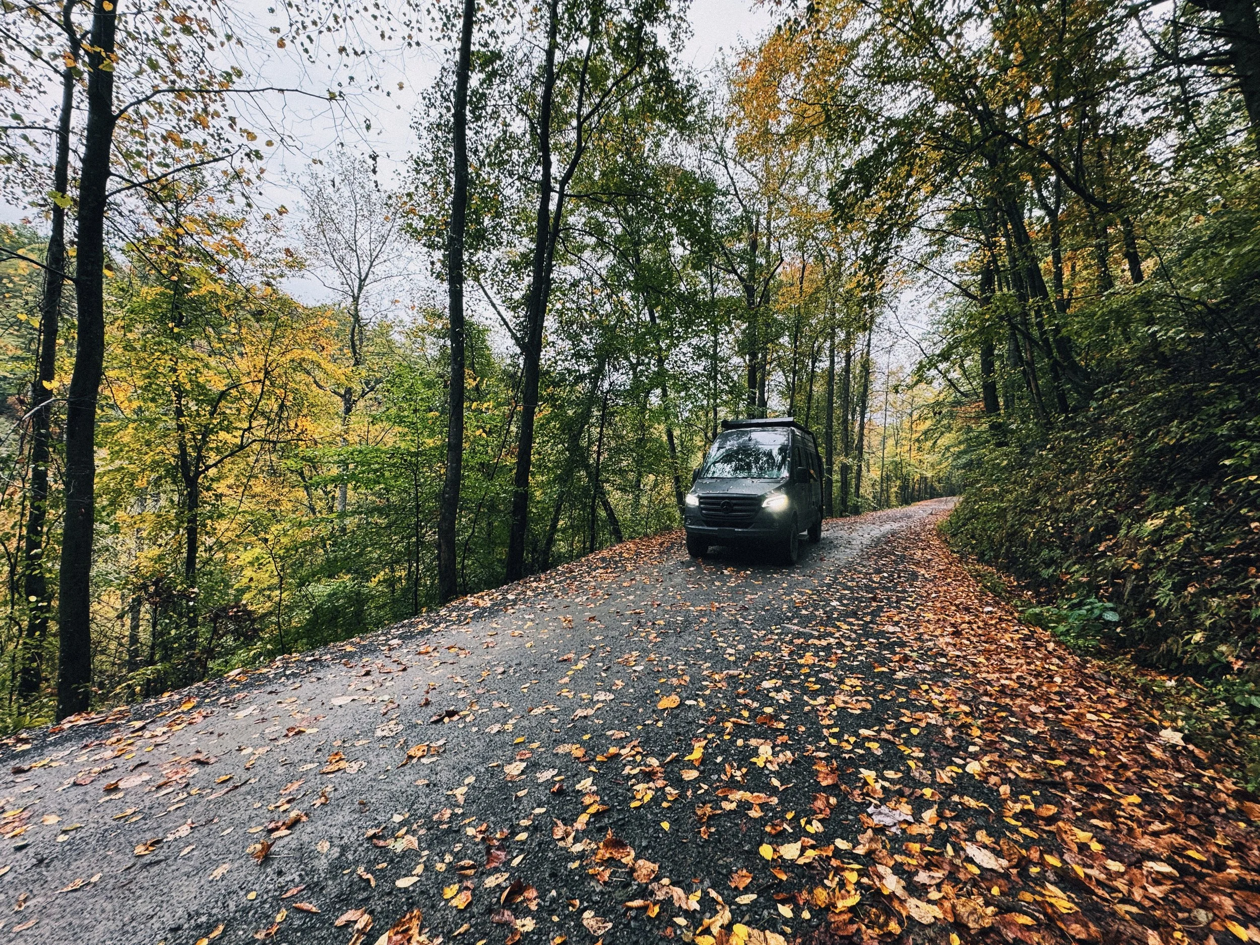 Sprinter van on a wet, leaf-covered forest road in North Georgia.