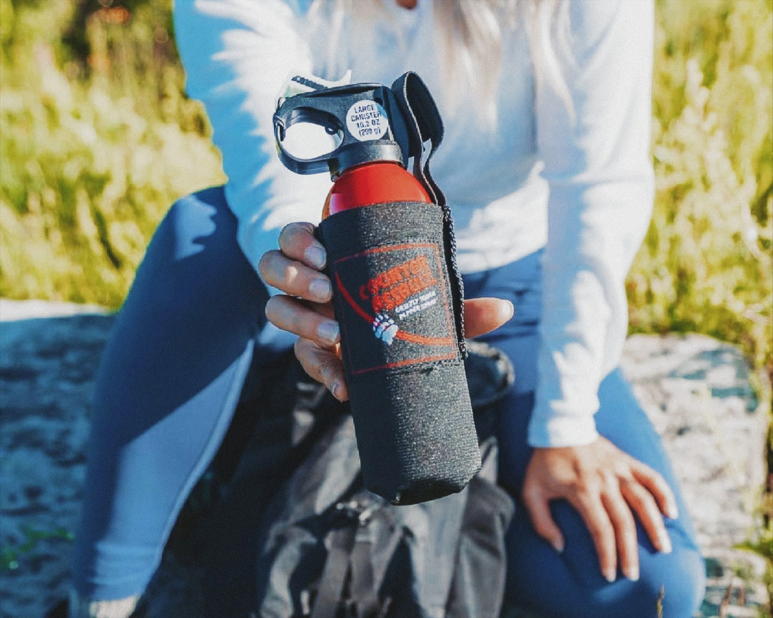 Counter Assault bear spray in a holster held in hand, ready for use on the trail or at camp.