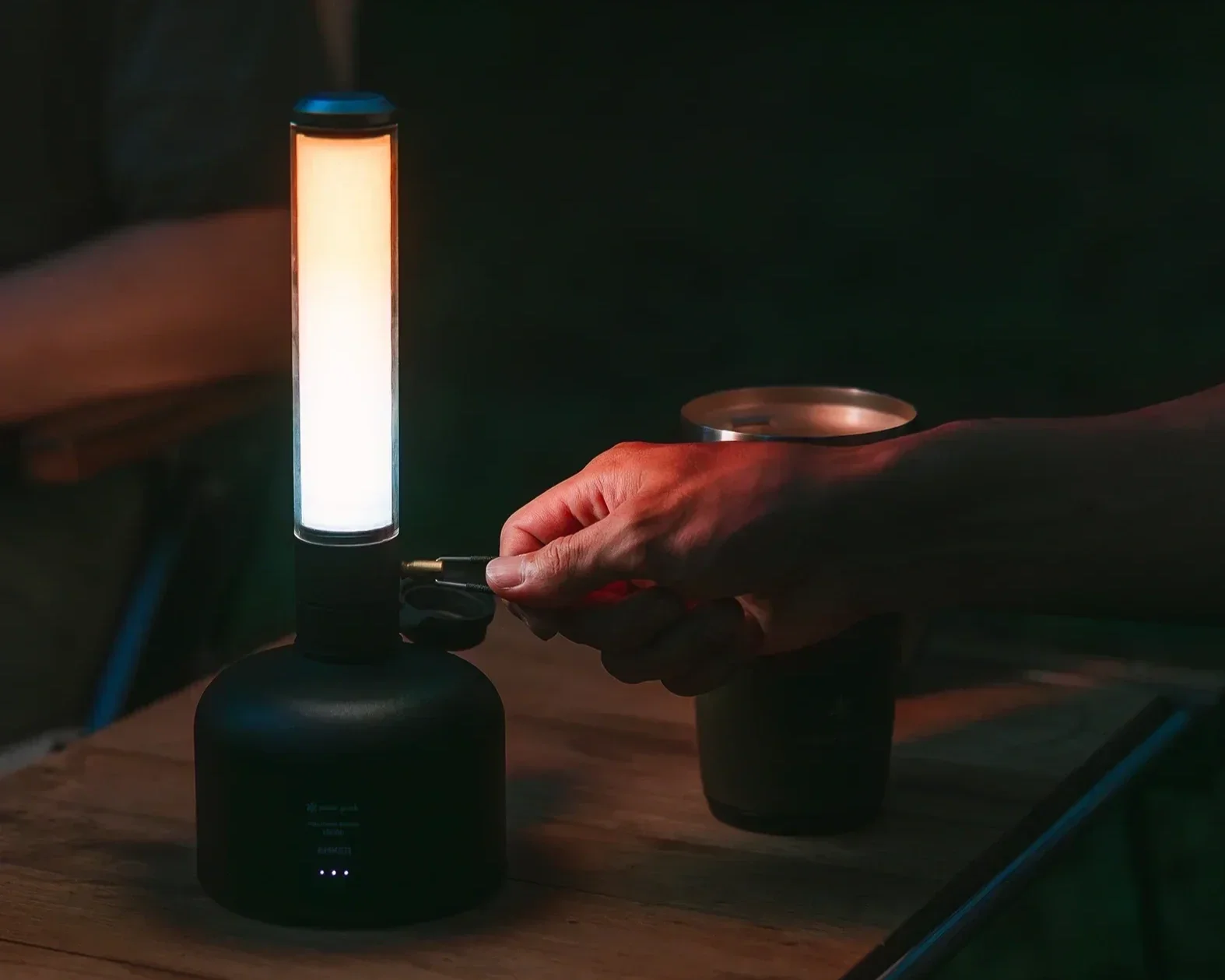 At the table: GigaPower Tabletop Lantern — true tabletop base, 360° LED, white + sunrise/sunset gradient modes; uses GigaPower Battery.