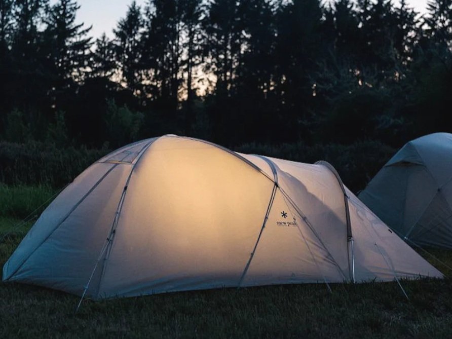 Snow Peak Amenity Dome Small tent glowing from inside at dusk, surrounded by trees