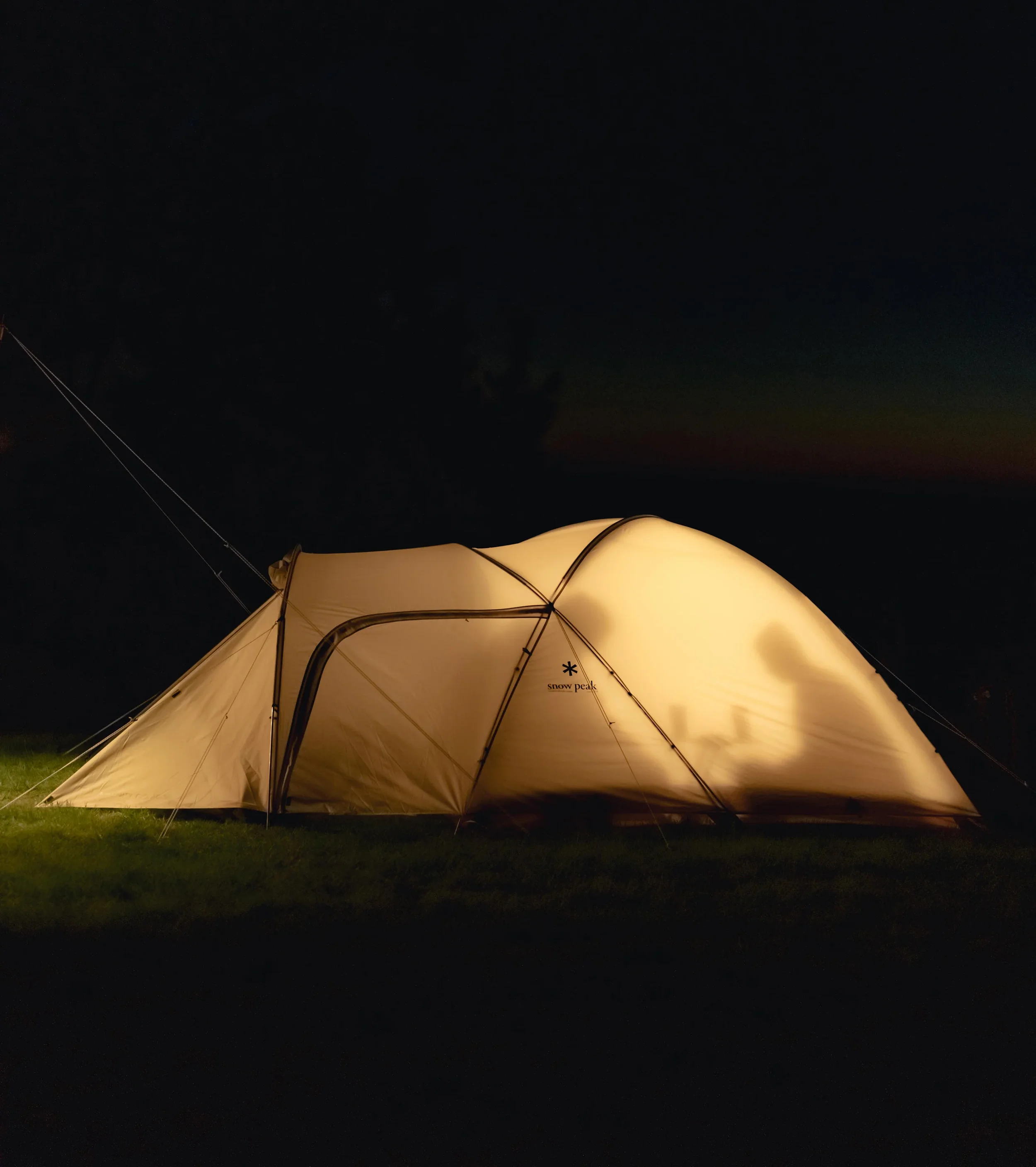 The Snow Peak Alpha Breeze glowing at night—spacious enough to feel like home.