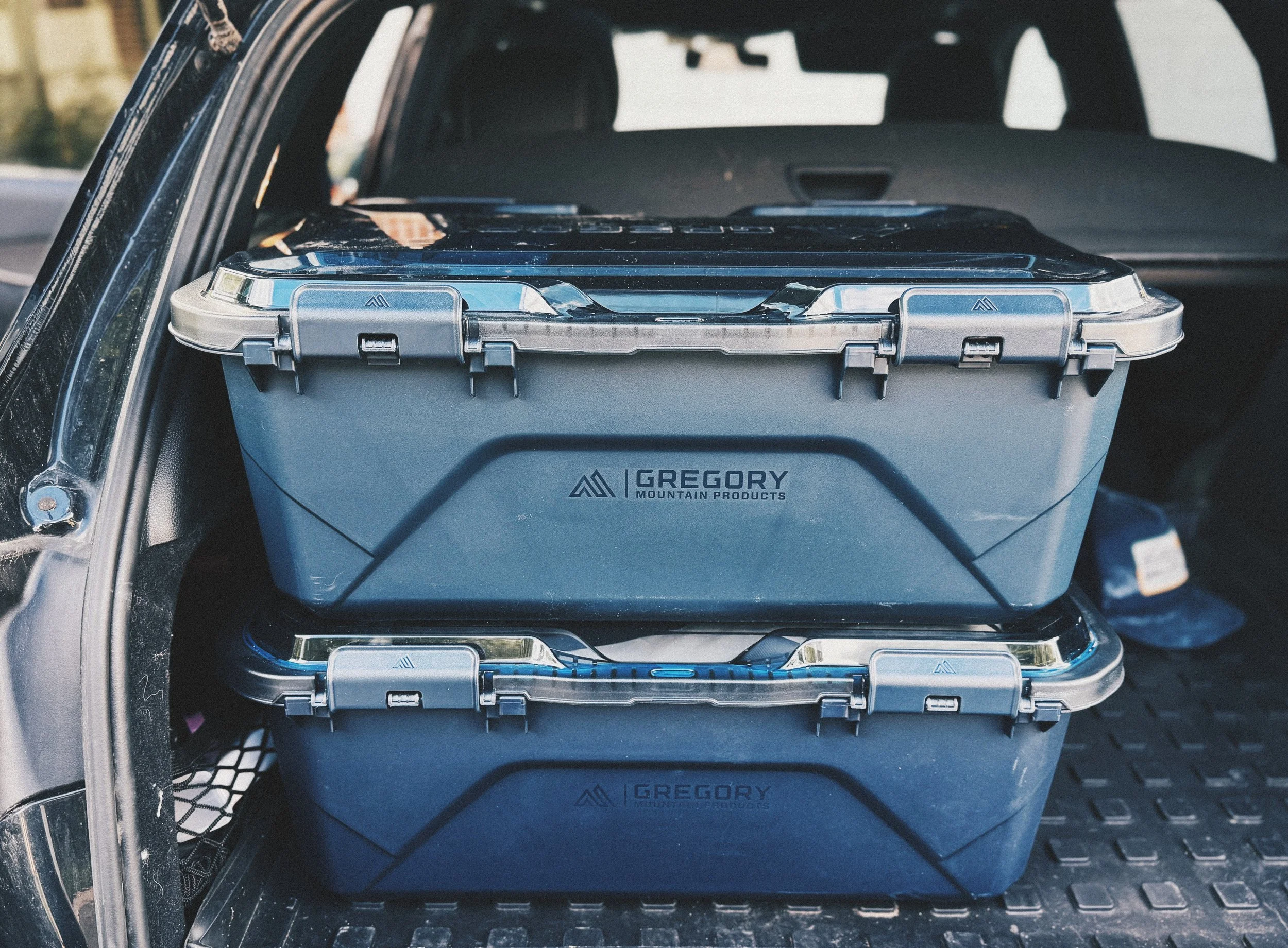 Two 45L Gregory Alpaca Gear Boxes stacked in the back of my Jeep—this is how I pack for most camping trips.