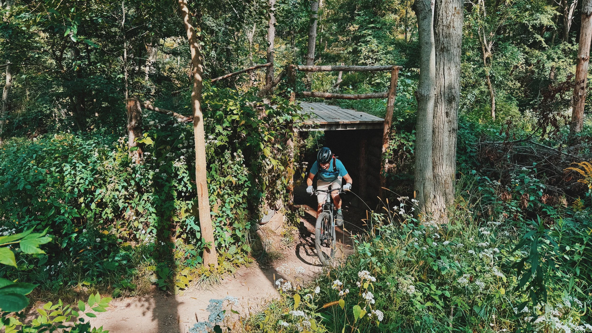 Gentleman riding under a bridge on the Don't Worry trail. The bridge is part of the Be Happy trail at Blackhawk Ski Club.