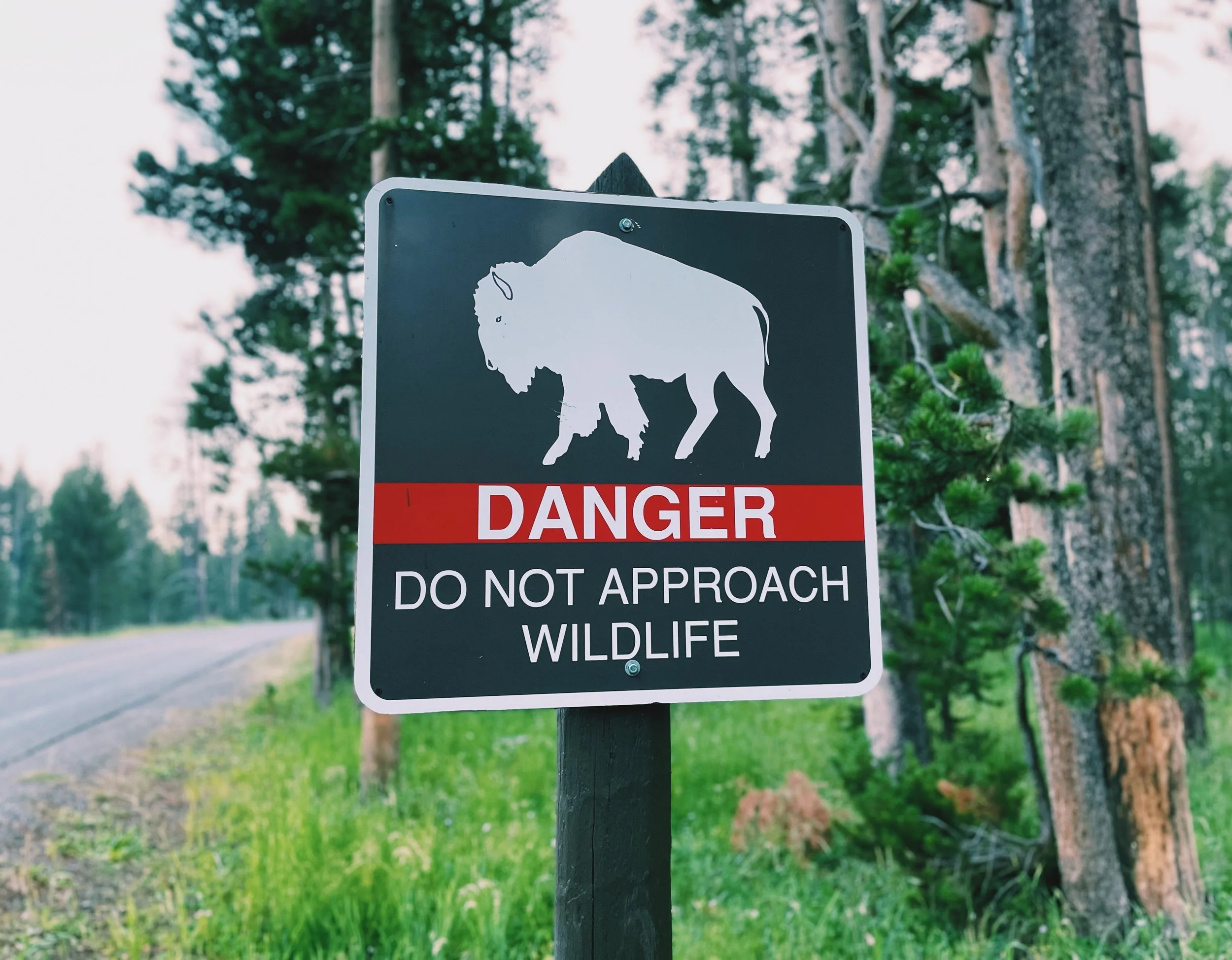 A warning sign with a silhouette of a bison, red band labeled "DANGER," and text saying "DO NOT APPROACH WILDLIFE," in a forested area.