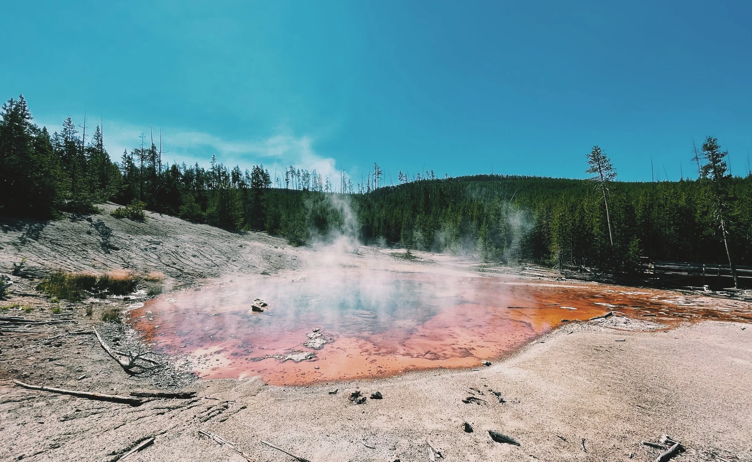 Hot spring with colorful orange and red mineral deposits, surrounded by trees under a blue sky.