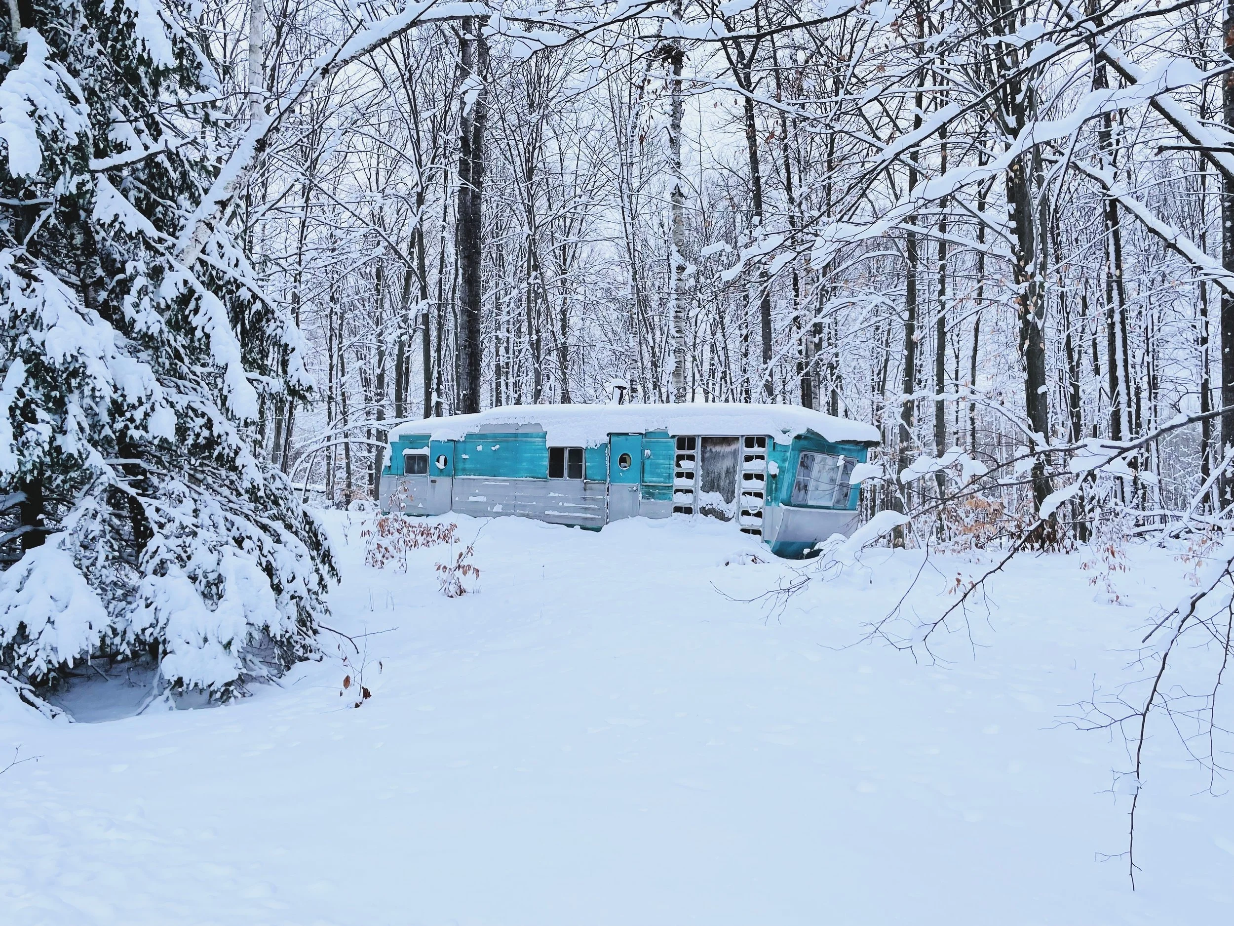 An abandoned camper trailer covered in snow in a winter forest with snow-covered trees and branches surrounding it.