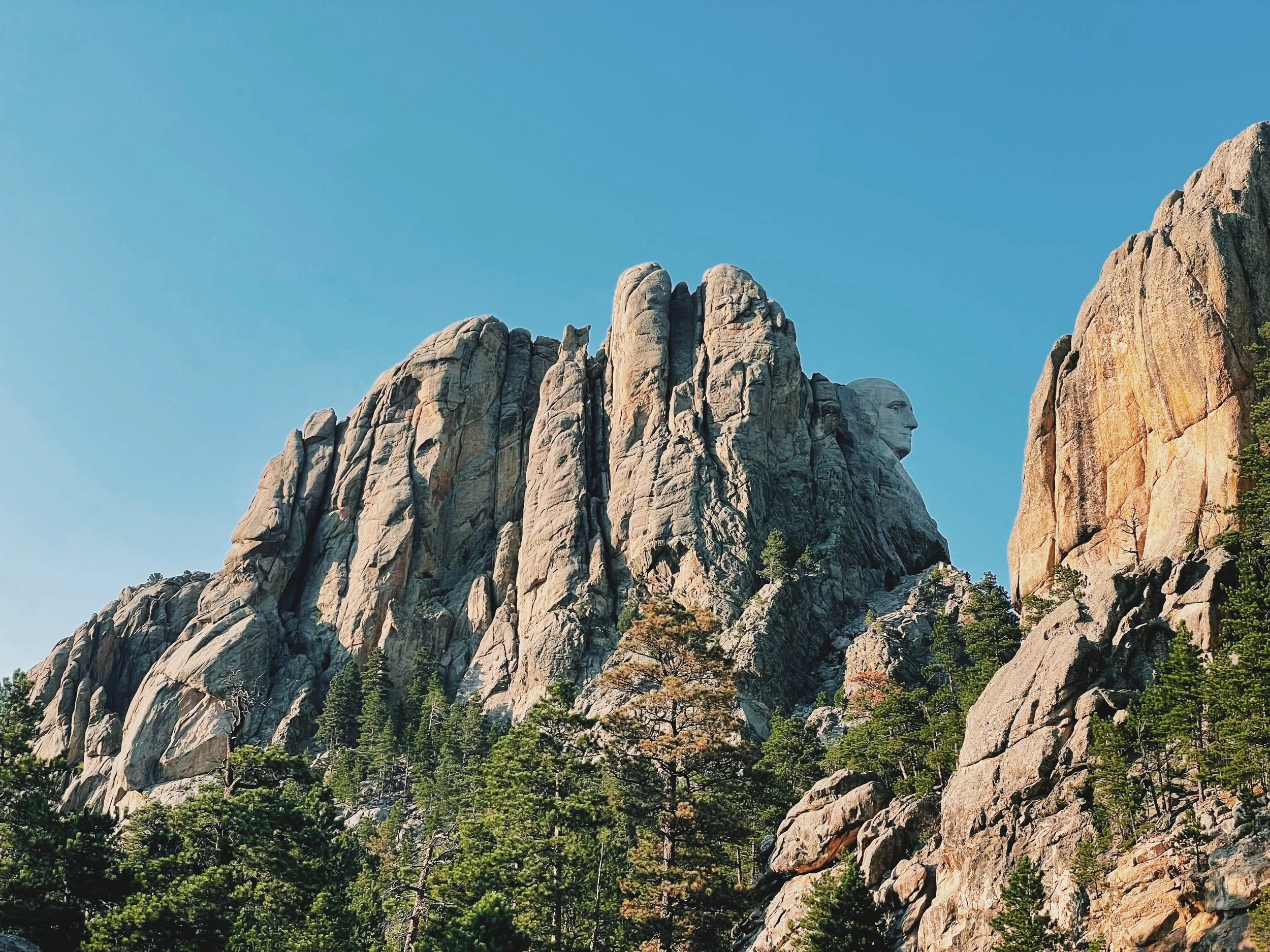 Mount Rushmore National Memorial with carved faces of four U.S. Presidents in granite mountain, surrounded by pine trees, under clear blue sky.