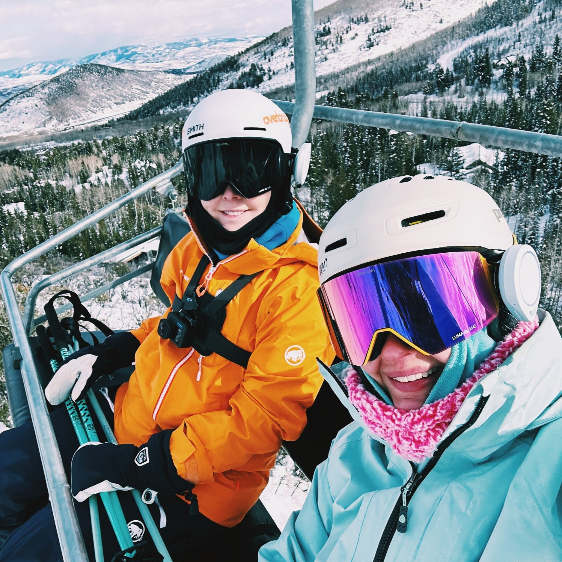 On the lift in Park City, wearing Mammut gear that blocks wind and keeps me warm on long chair rides.